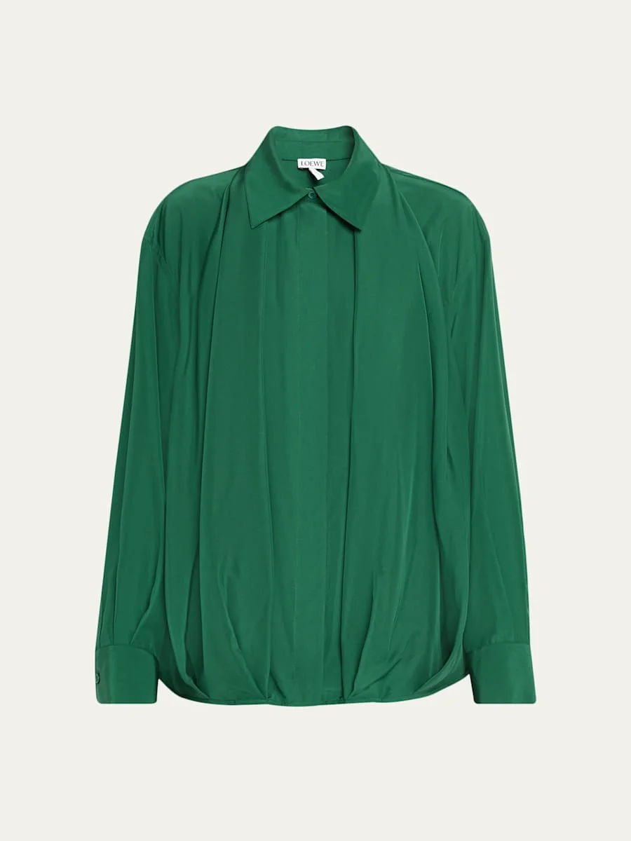 Loewe blouse in silk charmeuse cascades from gentle gathers at the shoulders into an artfully sculpted bubble hem, creating relaxed, fluid elegance with dropped seams and lightweight sophistication Point collar; concealed button front Long sleeves; button cuffs Oversized fit Silk/polyester Made in Italy Online Inquiries: BGS21_BAZJ8| Store Inquiries: #5357428