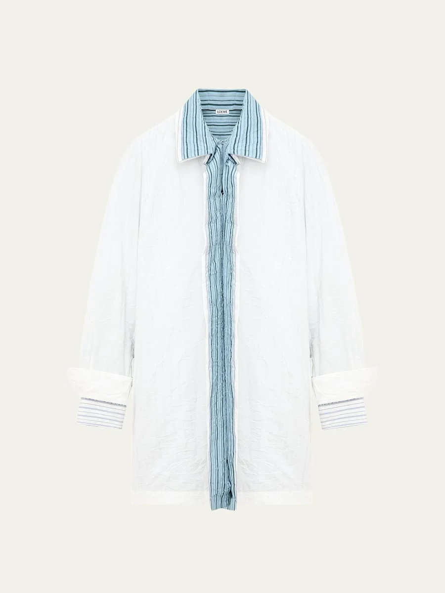 Crafted from crinkled cotton poplin, this shirtdress from Loewe features a layered striped collar, plaquet, and cuffs Spread collar; concealed button front Long sleeves; double barrel cuffs Shift silhouette Mini length Cotton/polyester Professional cleaning recommended Made in Italy