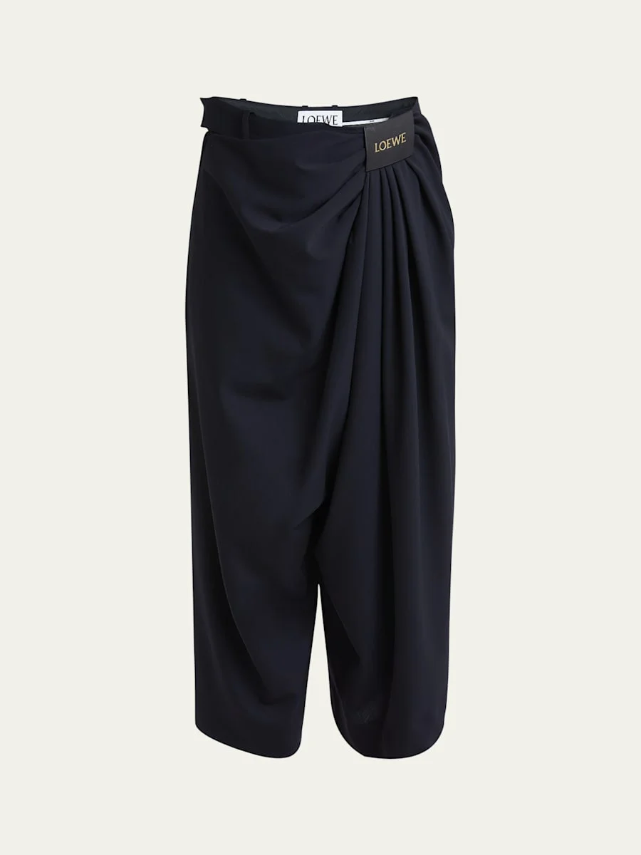 Loewe draped trousers with an Anagram embossed leather patch placed on the side Cropped fit High rise Wide legs Side slip pockets Wool/viscose Lining: Cotton/polyester/viscose Trim: Leather Made in Italy Online Inquiries: BGS21_B9WGG| Store Inquiries: #4987440