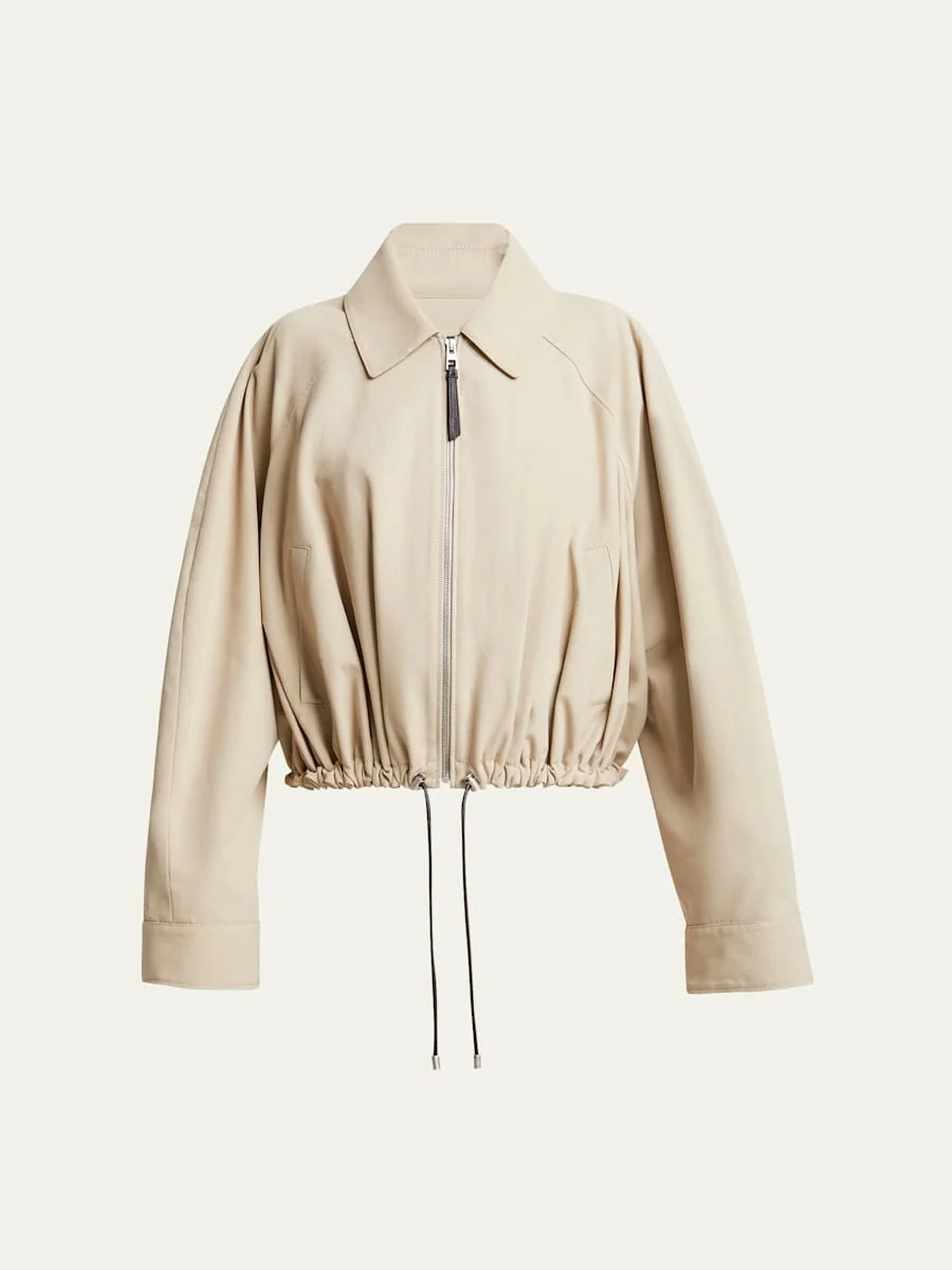 Loewe jacket with a lambskin leather label on the back Spread collar; zip front Long sleeves; button cuffs Side pockets Balloon silhouette Cropped length Drawstring hem Cotton self/lining Dry clean Made in Italy Model is 5'10"/177cm. Online Inquiries: BGS21_B9MWS| Store Inquiries: #4918636