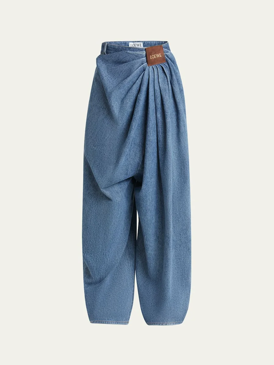 Loewe jeans with asymmetric gathered draping at the front and a logo embossed calf leather patch Mid rise Full length Loose legs Side slip pockets; back pocket Belt loops; side zip fastening Mohair/nylon/polyamide/wool Made in Italy Online Inquiries: BGS21_B9WG4| Store Inquiries: #4987428