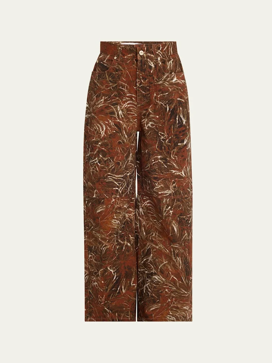 Feather Printed Denim Wide-Leg Pants