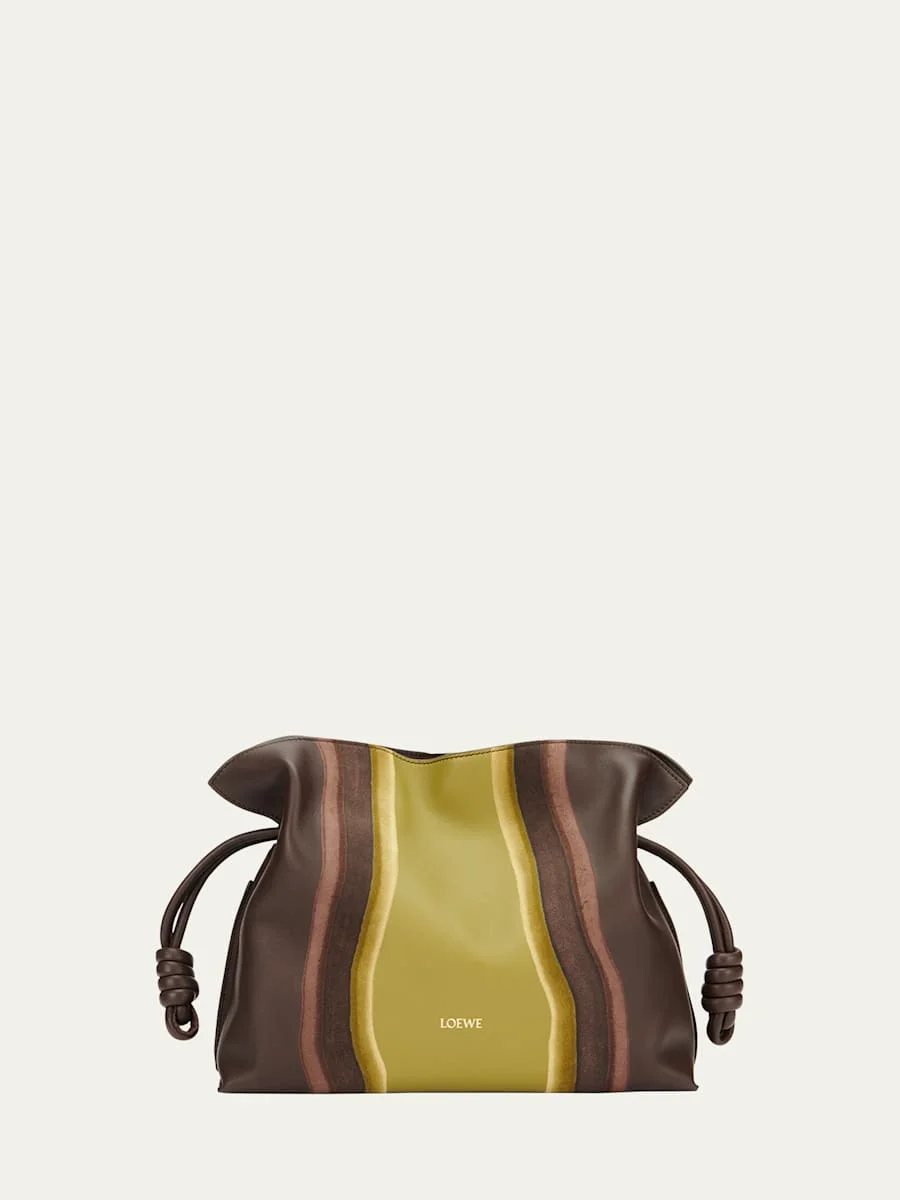 Loewe "Flamenco" soft and slouchy clutch bag crafted in nappa calfskin leather with wavy suede-effect print Detachable, adjustable shoulder strap Can be worn as a clutch or a shoulder/crossbody bag Open top with magnetic closure Approx. 9.6"H x 11.7"W x 4.1"D Made in Spain Online Inquiries: BGS21_V6LMK| Store Inquiries: #5045431
