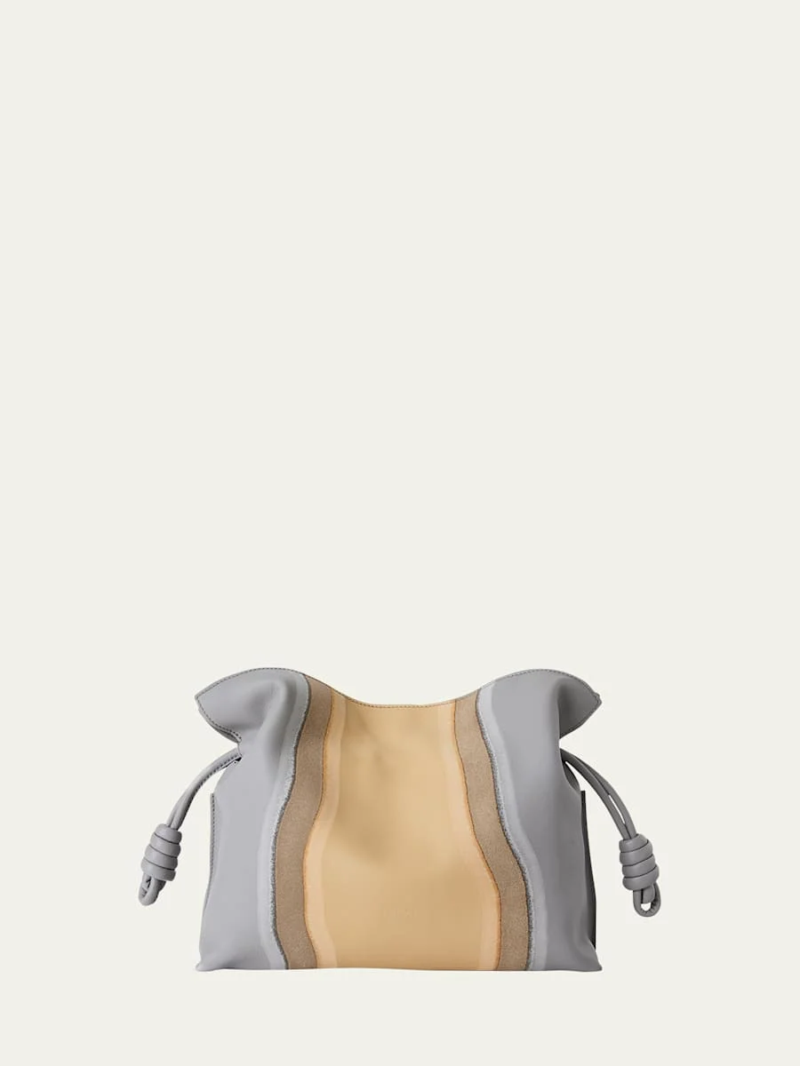 Loewe "Flamenco" soft and slouchy clutch bag crafted in nappa calfskin leather with wavy suede-effect print Detachable, adjustable shoulder strap Can be worn as a clutch or a shoulder/crossbody bag Open top with magnetic closure Approx. 9.6"H x 11.7"W x 4.1"D Made in Spain Online Inquiries: BGS21_V6LMK| Store Inquiries: #5045431