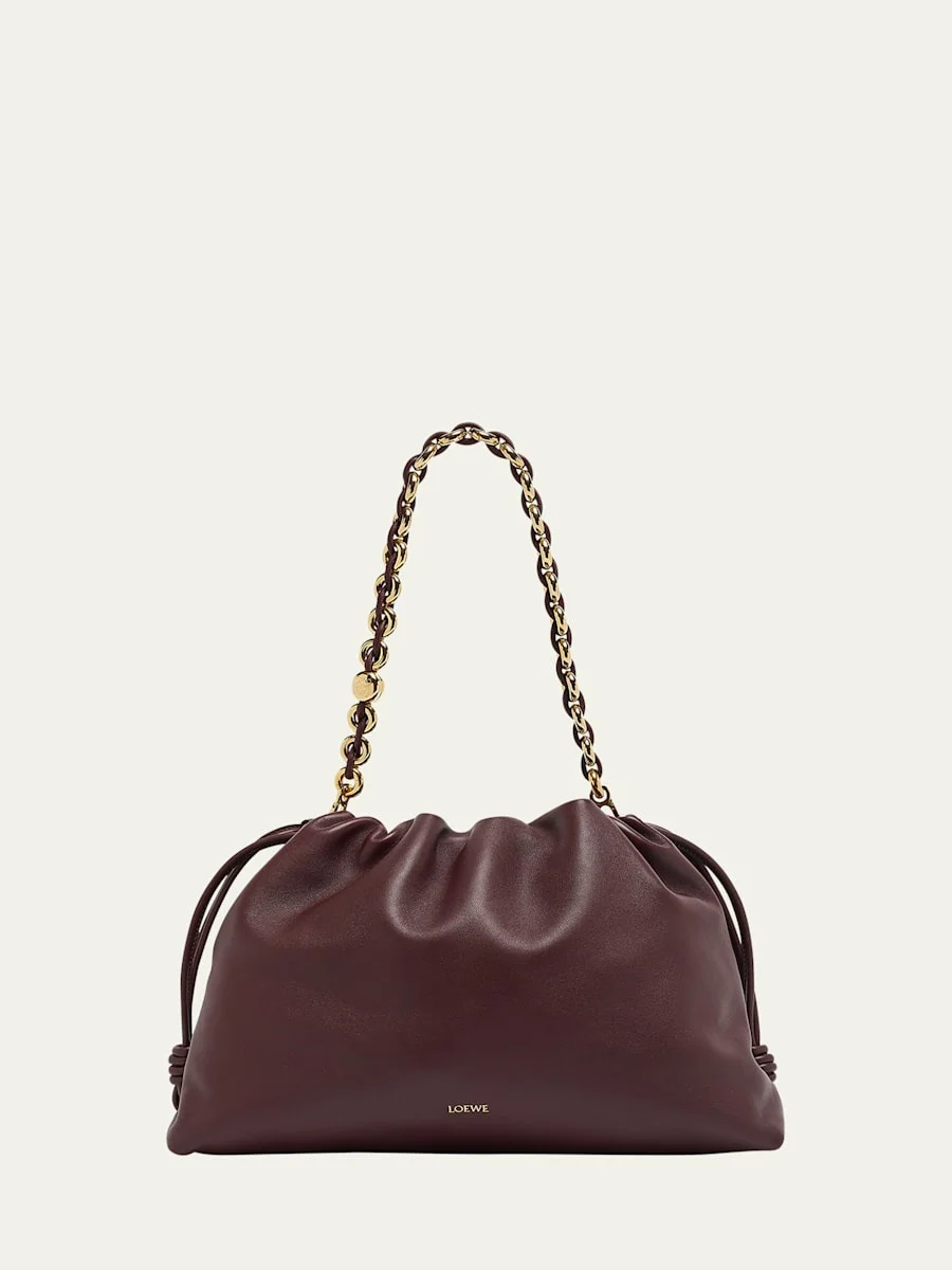 Loewe "Flamenco" shoulder bag in napa lambskin leather Chain shoulder strap Detachable leather shoulder strap Drawstring and magnetic closures Approx. 15"H x 9.4"W x 3.5"D Made in Spain Online Inquiries: BGS21_V6CDN| Store Inquiries: #4885587