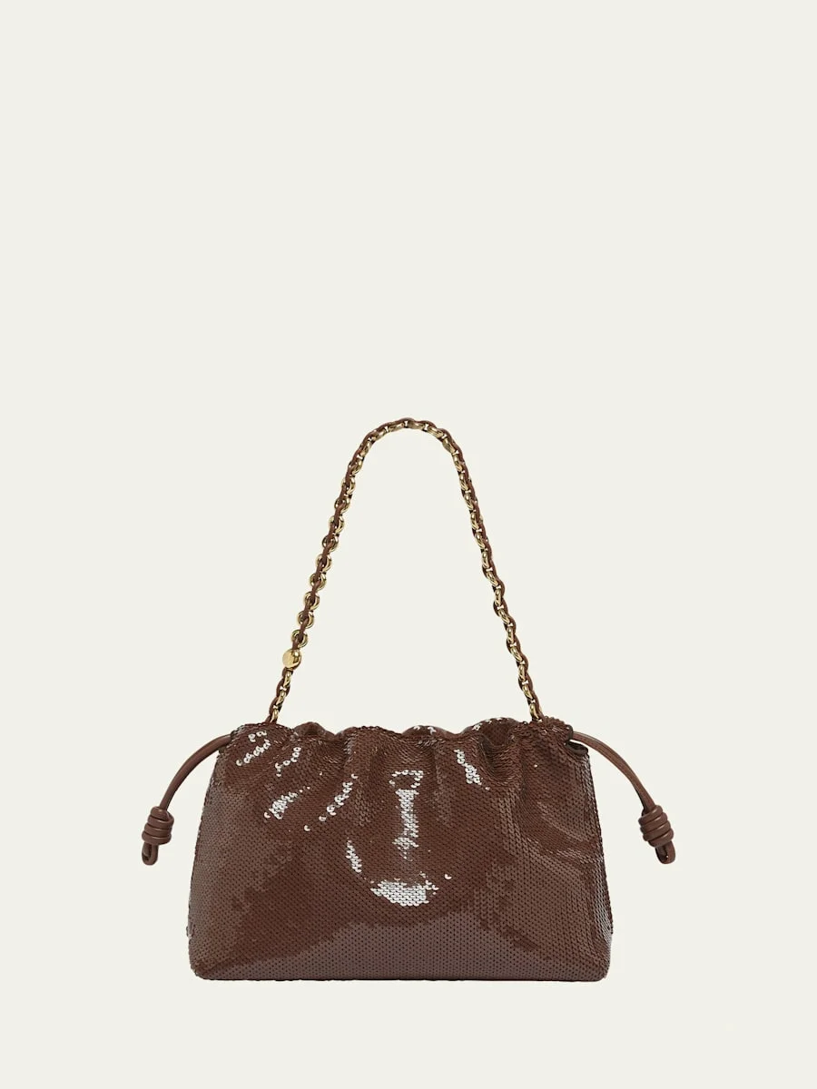Loewe medium "Flamenco" bag sparkles in sequins with signature leather knots on the side Ruched magnetic closure Straps offer versatility, allowing you to wear the bag on your shoulder, as a crossbody, or by hand Detachable and adjustable leather strap Detachable donut chain with an Anagram Approx. 3"H x 14"W x 4"D Suede lining Made in Spain Online Inquiries: BGS21_V6GWE| Store Inquiries: #4988209