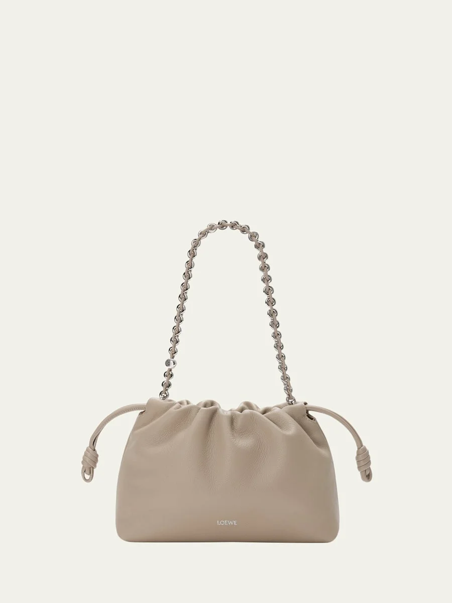 This Loewe "Flamenco" shoulder bag is crafted in leather and gathered along the top with soft ruching Detachable donut chain shoulder strap Can be worn as a clutch, top handle, or shoulder bag Drawstring and magnetic closure Approx. 7.8"H x 11.7"W x 4.1"D Professional cleaning recommended Made in Spain