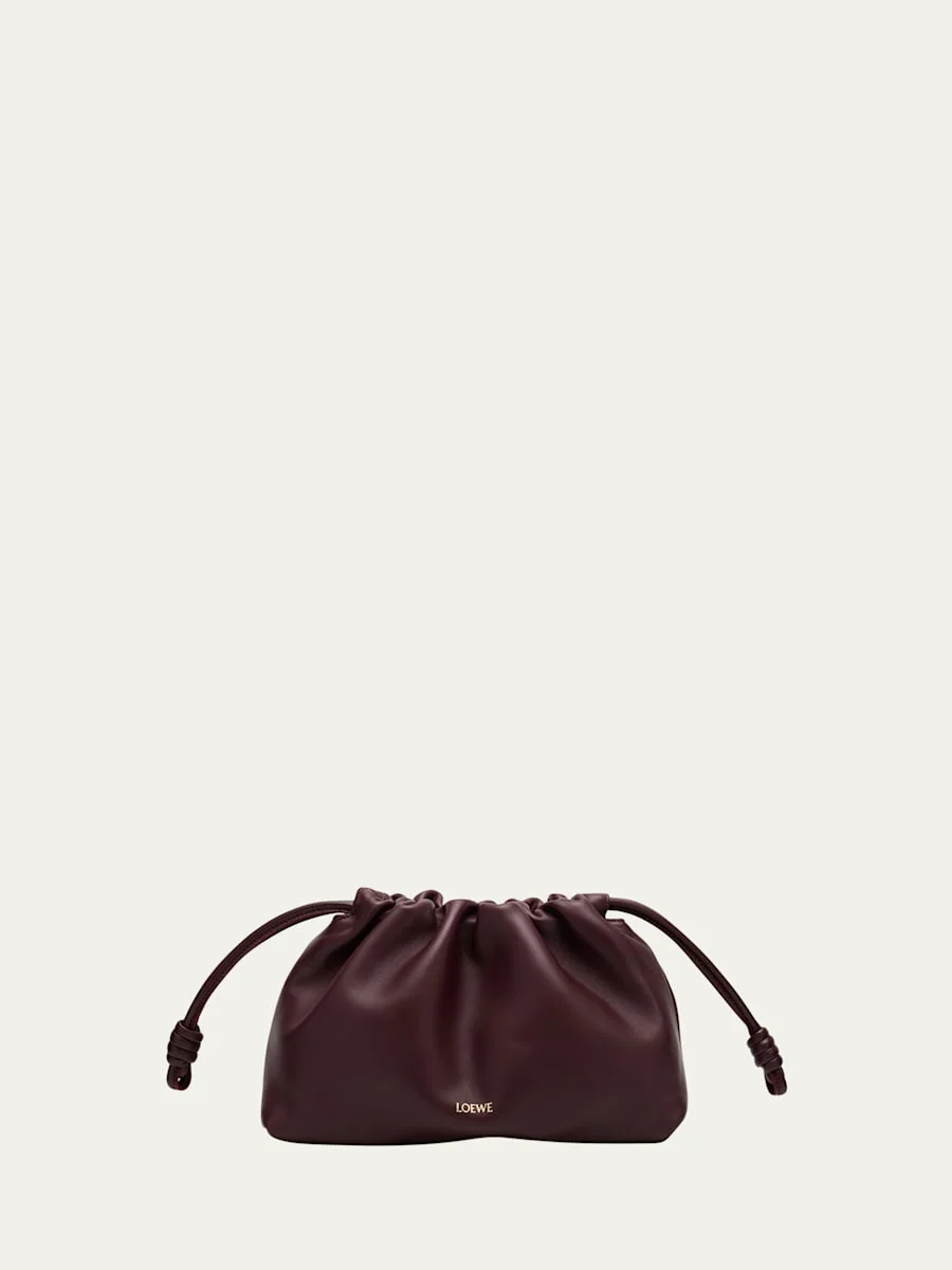 Loewe "Flamenco" ruched shoulder bag crafted in smooth leather with goldtone hardware Detachable donut chain shoulder strap Detachable, adjustable leather shoulder strap Drawstring and magnetic closure Suede lining Approx. 7.8"H x 11.7"W x 4.1"D Made in Spain