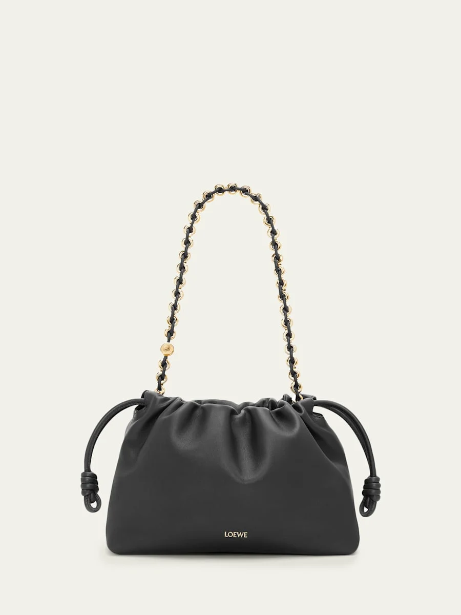 Loewe "Flamenco" ruched shoulder bag crafted in smooth leather with goldtone hardware Detachable donut chain shoulder strap Detachable, adjustable leather shoulder strap Drawstring and magnetic closure Suede lining Approx. 7.8"H x 11.7"W x 4.1"D Made in Spain