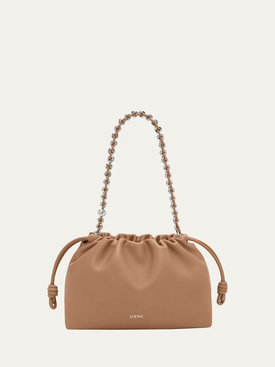 Loewe "Flamenco" ruched shoulder bag crafted in smooth leather with goldtone hardware Detachable donut chain shoulder strap Detachable, adjustable leather shoulder strap Drawstring and magnetic closure Suede lining Approx. 7.8"H x 11.7"W x 4.1"D Made in Spain