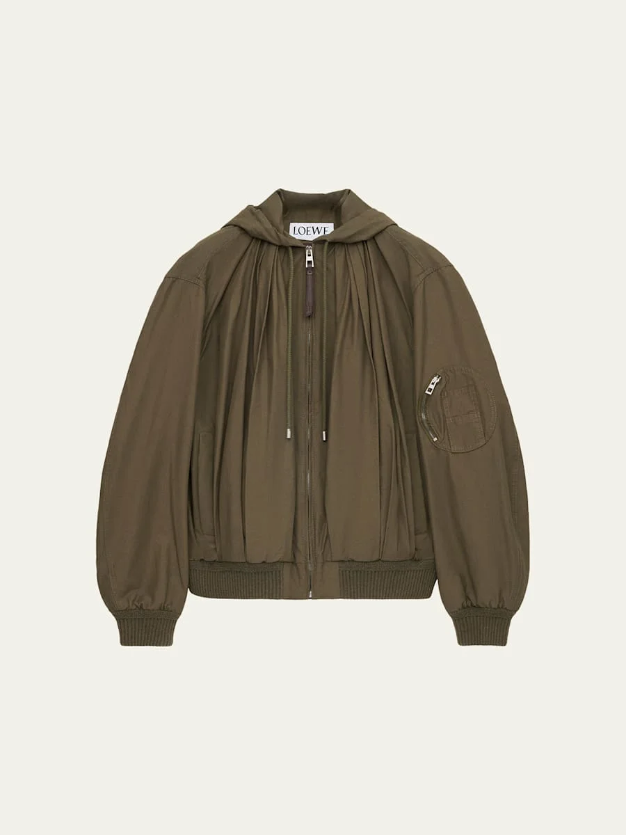 This bomber jacket by Loewe is rendered in a gathered construction with a zipper pocket at the wearer's left sleeve Hooded neckline with adjustable drawstrings Dropped shoulders Long sleeves Sideentry welt pockets Relaxed fit Hip length Ribbed cuffs and hem Cotton/nylon/polyamide Made in Italy