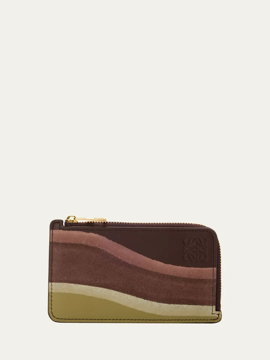 Loewe card holder made in calfskin leather with wavy suede-effect print Zip top closure Exterior, four card slots Approx. 2.9"H x 5.1"W Made in Spain Online Inquiries: BGS21_D5ANU| Store Inquiries: #5045436