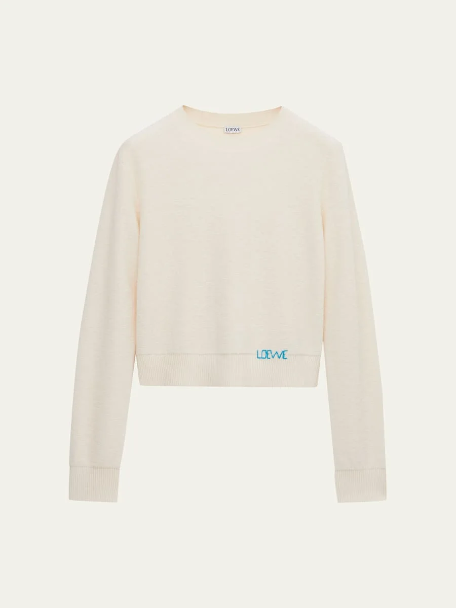 Loewe sweater is crafted of a warm wool knit featuring a contrast handstitched logo on the hip Crew neckline Long sleeves Relaxed fit Ribbed cuffs and hem Pullover style Wool/acrylic Made in Italy