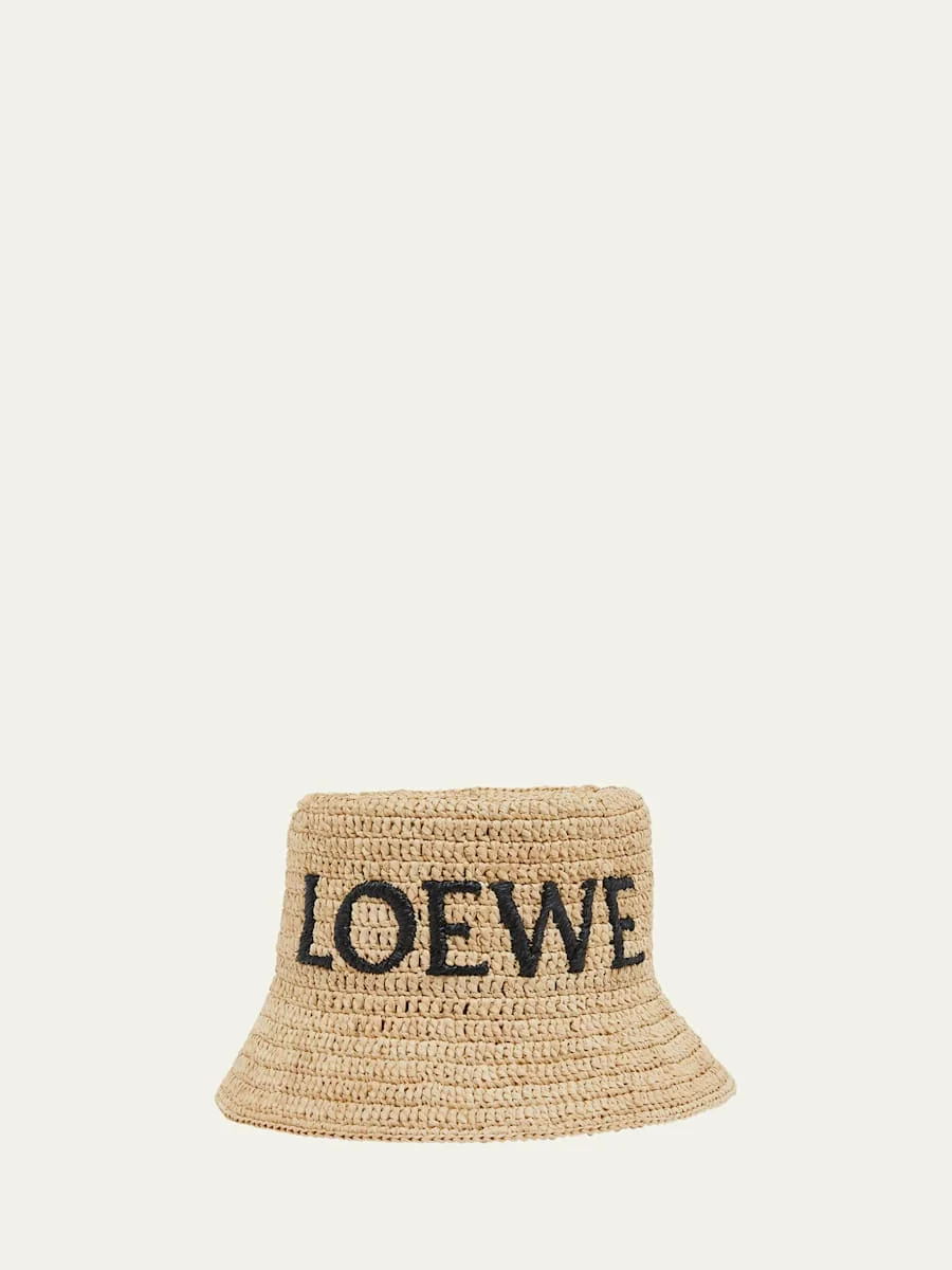 Loewe woven bucket hat in raffia, cotton, and viscose Flat crown Logo accent Downturned brim Imported Online Inquiries: BGS21_D4Y1F| Store Inquiries: #4809588