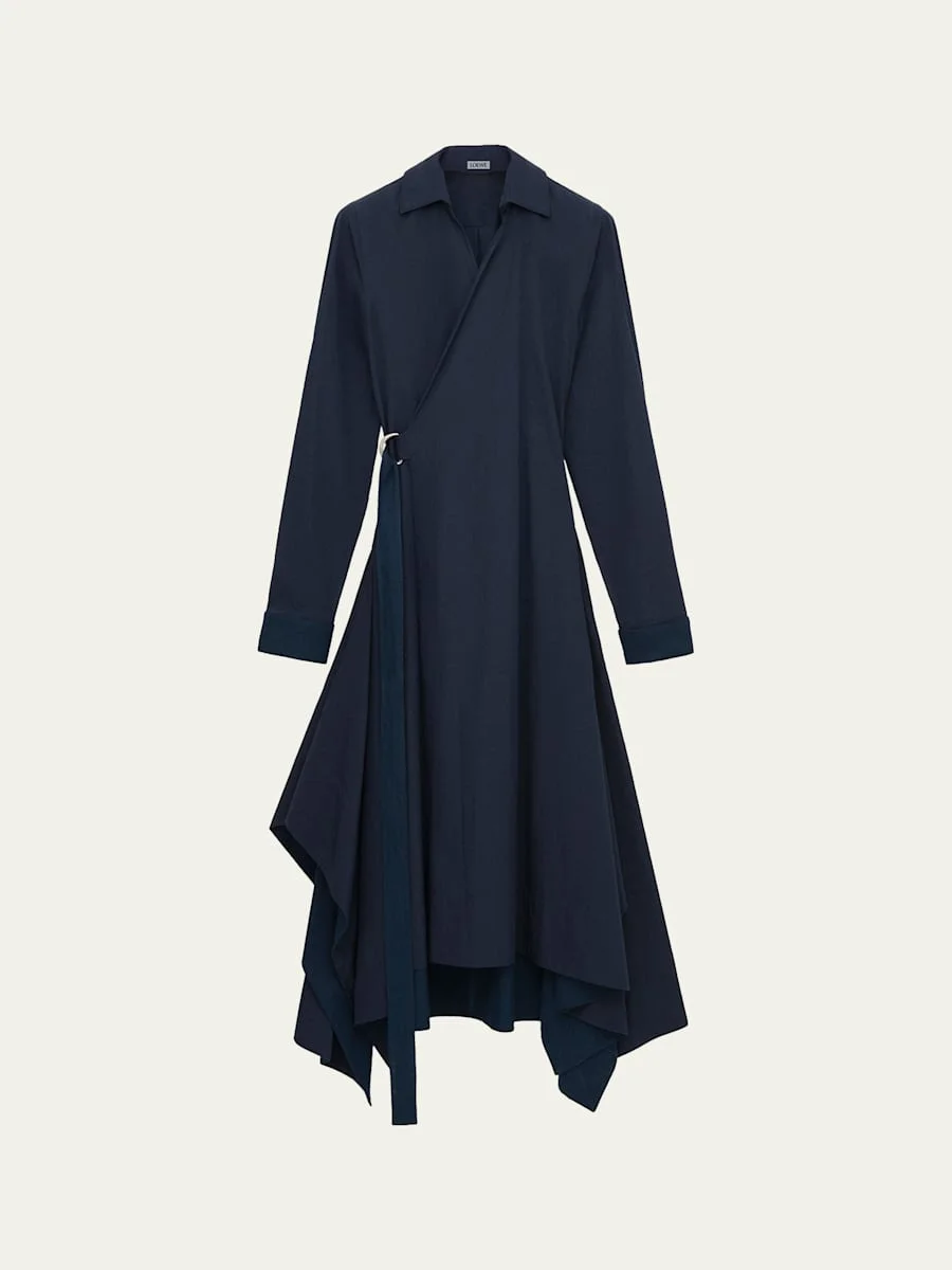 Loewe wrap shirtdress is crafted from cottonblend accented with a Dring wrap waist and a handkerchief skirt Spread collar; surplice front Long sleeves Aline silhouette Hem falls below the knee Hendkerchief hem Dring waist wrap closure Cotton/polyester Professional cleaning recommended Imported