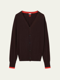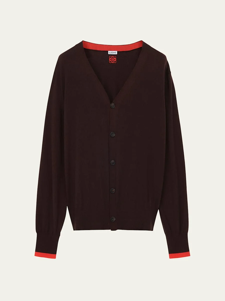 Loewe knit cardigan highlighted with contrasting trim on the cuffs and inner placket Signature Anagram on the interior V-Neckline Button front Long sleeves Ribbed cuffs and hem Wool/polyester Dry clean Made in Italy Online Inquiries: BGS21_NDGB9| Store Inquiries: #5037211