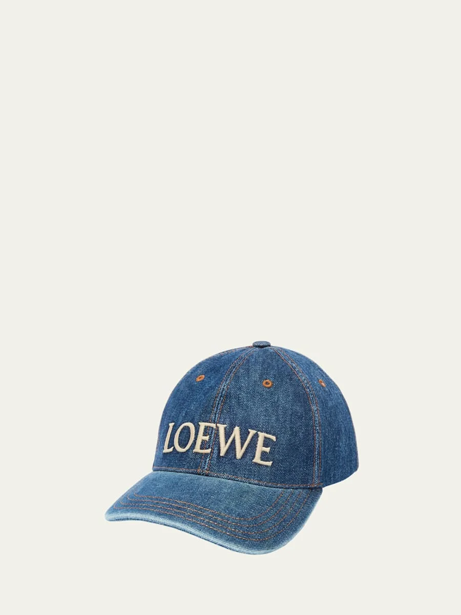 Loewe baseball cap in denim with contrast topstitching Embroidered logo on the front Top button Embroidered eyelets Curved stitched brim Cotton/leather Made in Italy Online Inquiries: BGS21_ND72B| Store Inquiries: #5025569