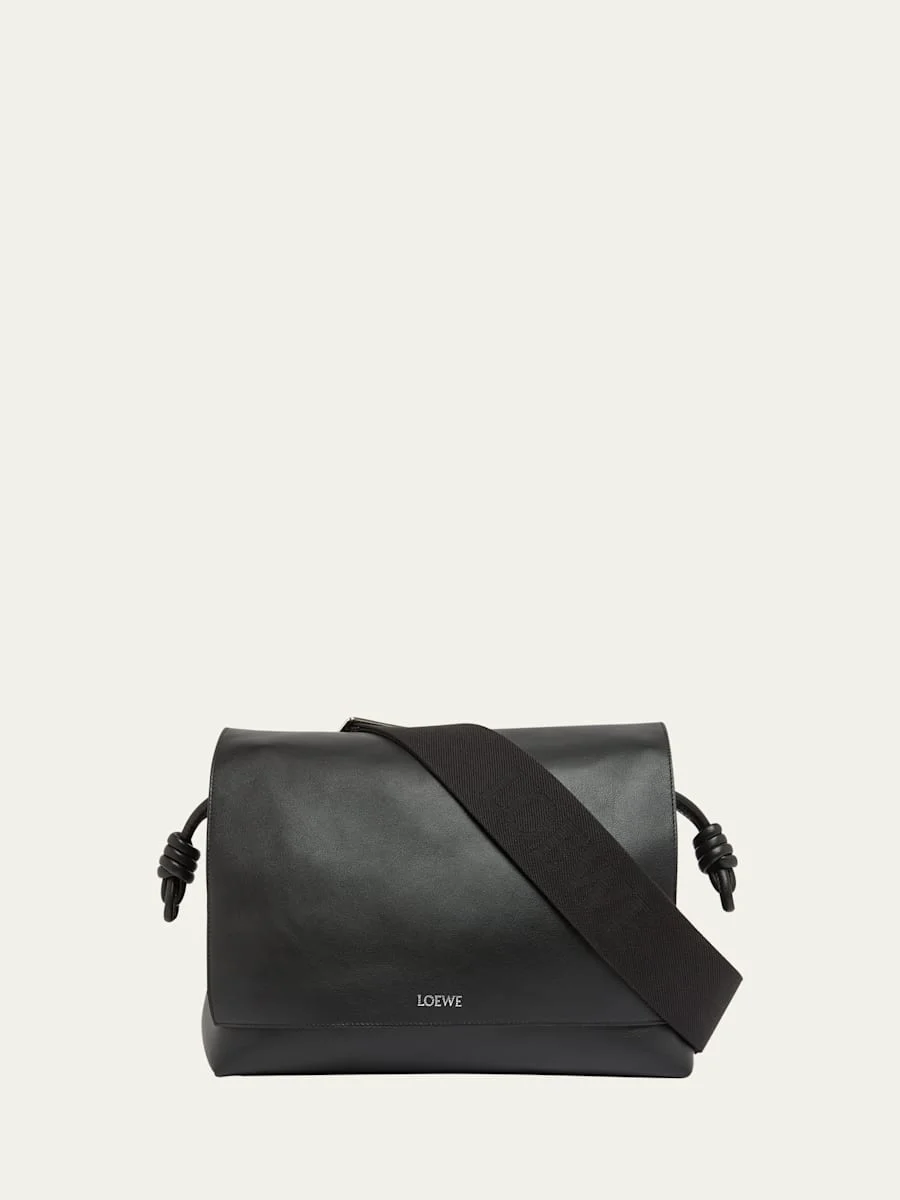 Loewe "Flamenco" messenger bag in smooth calfskin leather and polyester Magnetic flap top Adjustable shoulder strap Artfully knotted side drawstrings Internal zipper pocket Approx. 9.4"H x 13.3"W x 4.7"D Made in Italy Online Inquiries: BGS21_NCAP3| Store Inquiries: #4842104