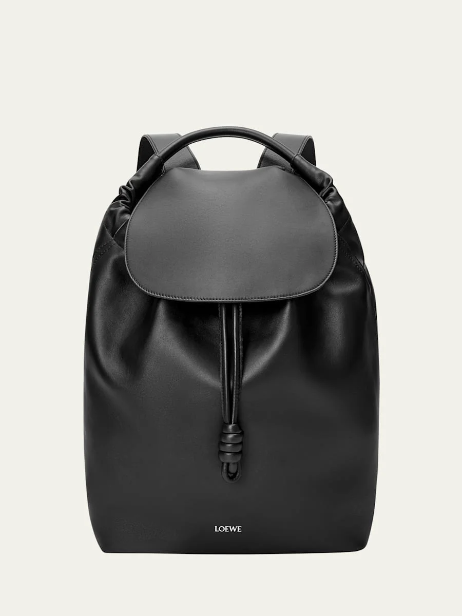 Loewe "Flamenco" backpack in suede with smooth leather trim Rolled top handle Adjustable shoulder straps Magnetic flap top Drawstring closure Side zipper pocket Two internal pockets Approx. 15.6"H x 14"W x 6.2"D Cotton/linen lining Made in Italy Online Inquiries: BGS21_NCAP4| Store Inquiries: #4844034