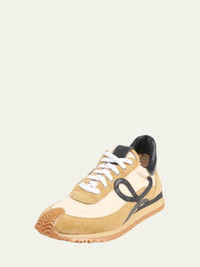 Loewe "Flow" runner sneakers in suede and leather and nylon. Flat heel with slight platform. Reinforced round toe. Lace-up vamp. Stitched L logo at side. Textured rubber sole runs from toe to backstay. Made in Italy. Online Inquiries: BGS21_NA2BQ| Store Inquiries: #4009043