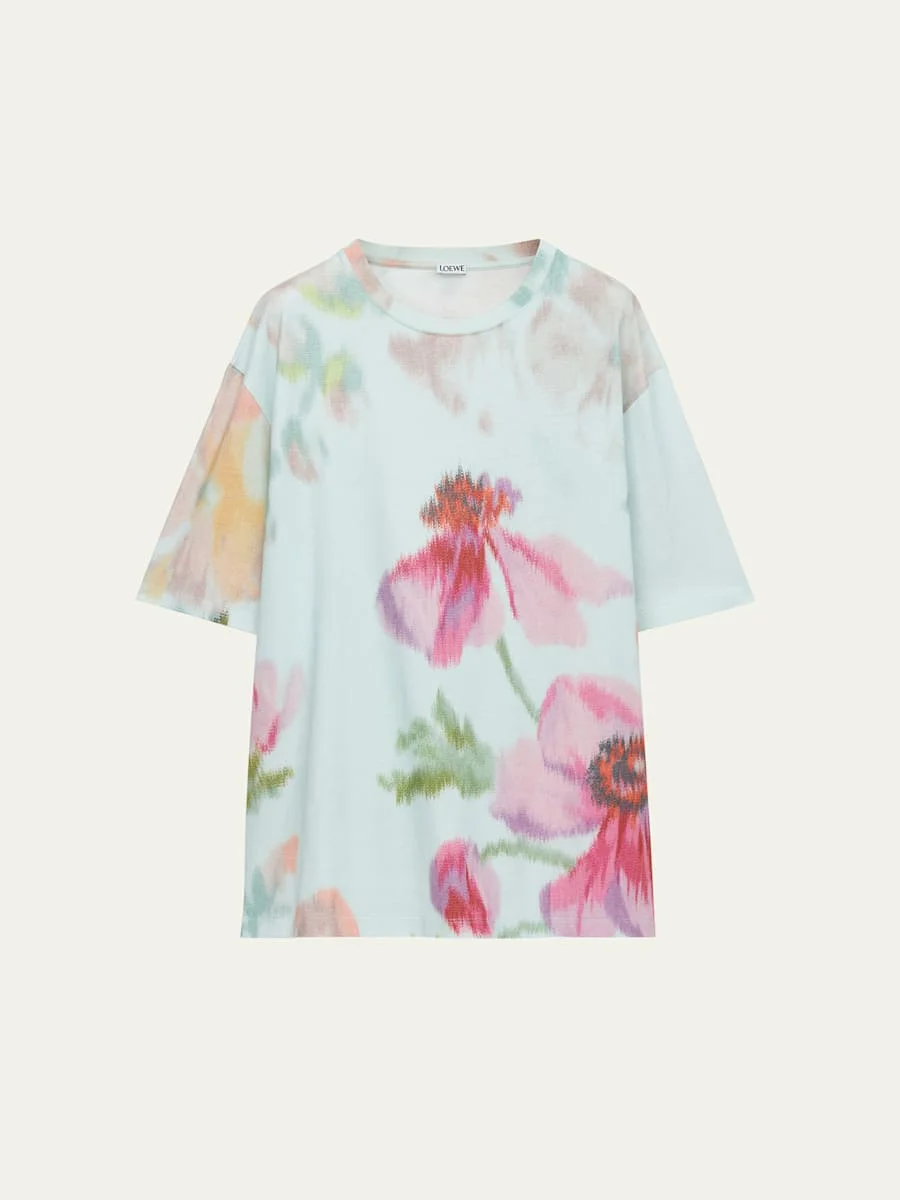 Loewe T-shirt in comfortable jersey fabric acented with a subtle abstract floral print Crew neckline Short sleeves Pullover style Cotton/elastane Dry clean Made in Portugal Online Inquiries: BGS21_NDGBD| Store Inquiries: #5037215