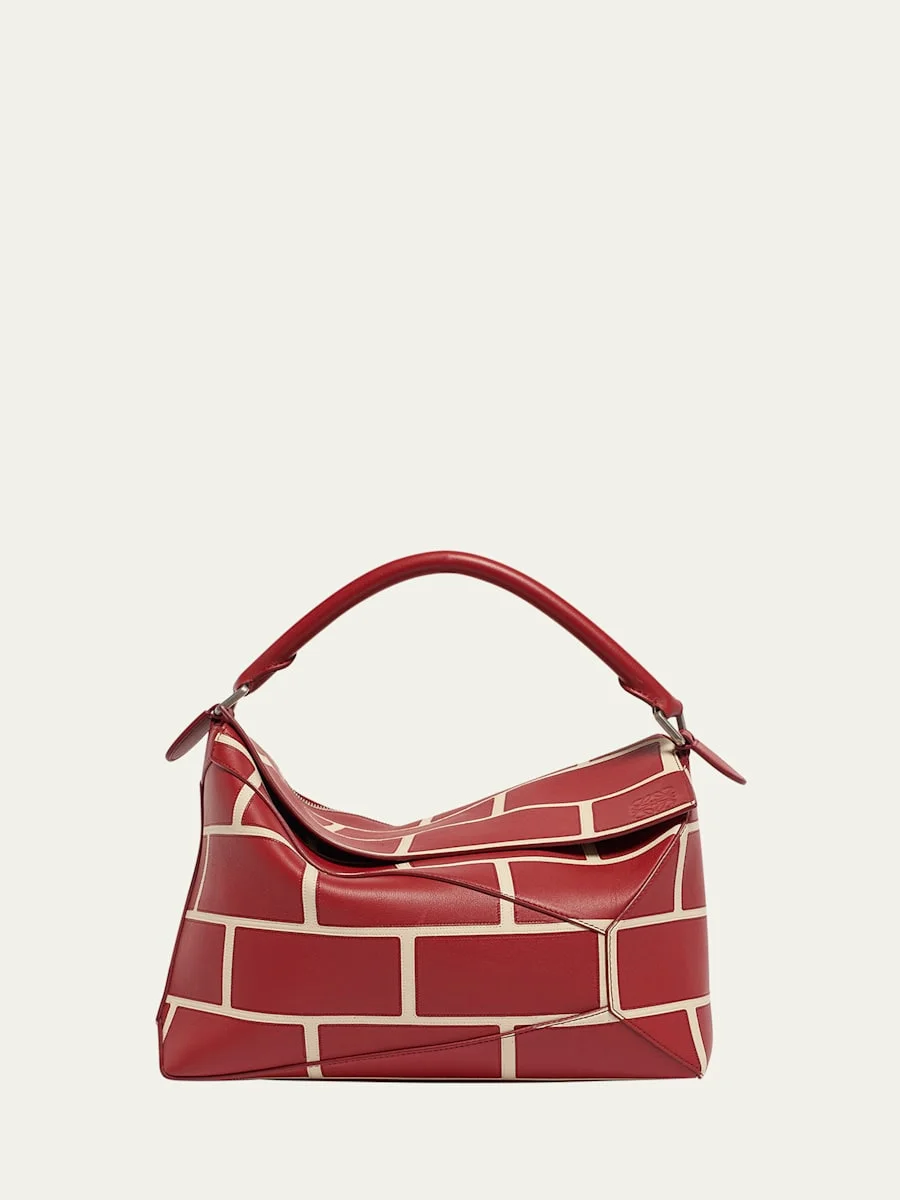 Loewe "Puzzle Edge" shoulder bag in leather defined by distinctive geometric lines, a cuboid shape, and an allover Brick motif Embossed Anagram Shoulder, crossbody or hand carry Detachable and adjustable strap Zip closure with calfskin pull Exterior, one back zip pocket Interior, two slip pockets Approx. 8.4"H x 12.9"W x 5.73"D Made in Spain Online Inquiries: BGS21_NDMGS| Store Inquiries: #5048993