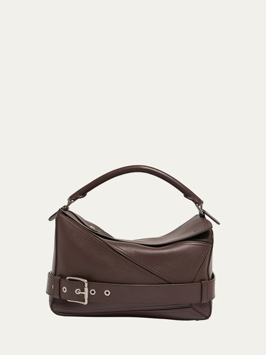 Loewe "Puzzle" shoulder bag in leather defined by a large buckle strap, distinctive geometric lines, and a cuboid shape Embossed Anagram Overlapped panels with single stitch lines Shoulder, crossbody or hand carry Detachable and adjustable strap Zip closure with calfskin pull Exterior, one back zip pocket Interior, two slip pockets Approx. 8.4"H x 12.9"W x 5.73"D Leather/cotton/linen Made in Spain Online Inquiries: BGS21_NDMGR| Store Inquiries: #5048992