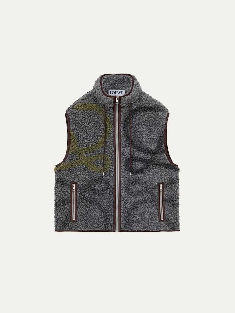 Loewe fleece vest printed with the signature monogram Stand collar with drawstrings Zip front closure Side zip pockets Sleeveless Straight hem Polyester/wool/cotton Dry clean Made in Italy Online Inquiries: BGS21_NDGBP| Store Inquiries: #5037225