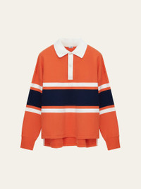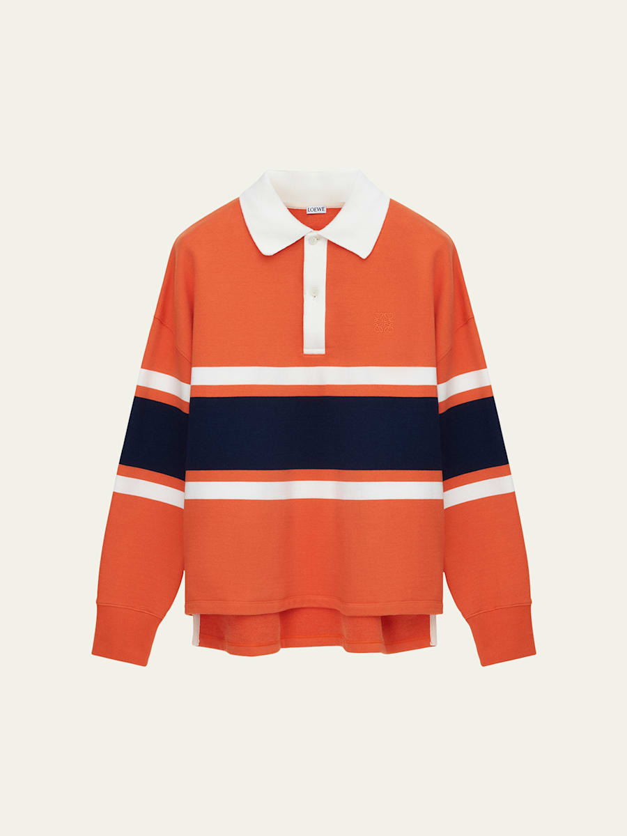 Loewe rugby shirt highlighted with a contrasting shirt collar and color block stripes Three-button placket Long sleeves Ribbed cuffs Uneven vented sides Pullover style Cotton/polyester/nylon Dry clean Made in Portugal Online Inquiries: BGS21_NDGBM| Store Inquiries: #5037223