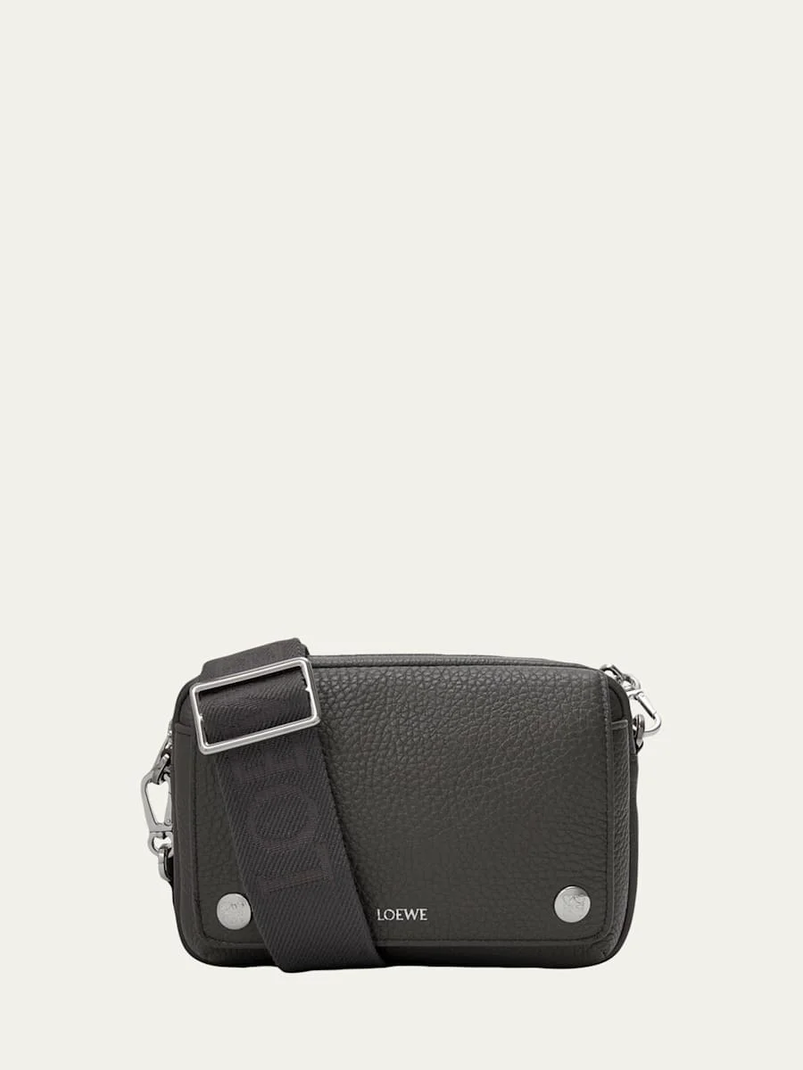 Loewe "Pebble" camera bag in grained calf leather Adjustable, detachable fabric logo strap Exterior, front pocket with magnetic closure Interior, two card slots Suede lining Zip top closure Approx. 7.8"W x 4.9"H x 2.3"D Made in Spain Online Inquiries: BGS21_NETJV| Store Inquiries: #5045730