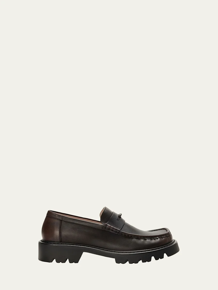 Embellished with an engraved metal donut detail on the vamp, the "Sierra" leather loafers by Loewe feature a bulky silhouette, perfect for adding an edgy touch to any outfit. 1.57 in / 40 mm chunky lugged heel Slightly squared moc toe Notched vamp with keeper strap Slipon style Leather/Polyurethane/TPU Made in Italy