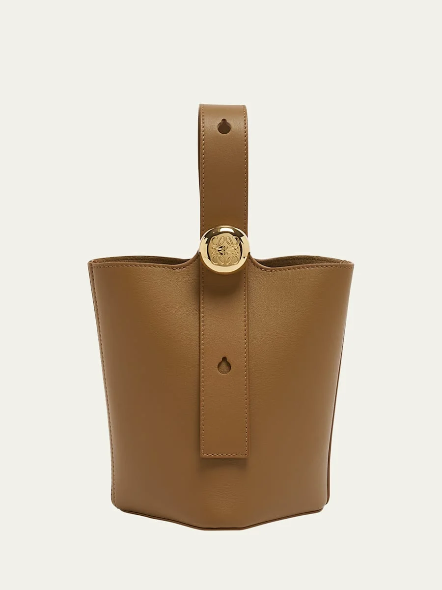 Loewe bucket bag in pebbled leather Adjustable top handle Detachable, adjustable shoulder strap Can be worn as a top handle or shoulder bag Open top Approx. 7.6"H x 6.2"W x 6.2"D Made in Spain Online Inquiries: BGS21_V6428| Store Inquiries: #4702501