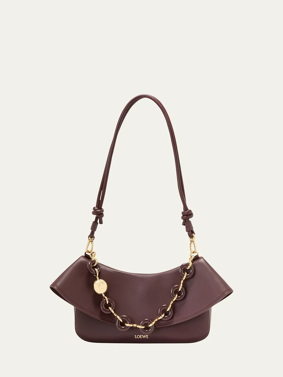 Lightweight and versatile, this Loewe "Ola" shoulder bag is crafted in smooth calfskin leather with gold-tone metal hardware Detachable donut chain shoulder strap Detachable, adjustable leather shoulder strap Can be worn as a shoulder or crossbody bag Flap top One internal pocket Approx. 7"H x 10.1"W x 5.1"D Made in Spain Online Inquiries: BGS21_V6LM7| Store Inquiries: #5045416