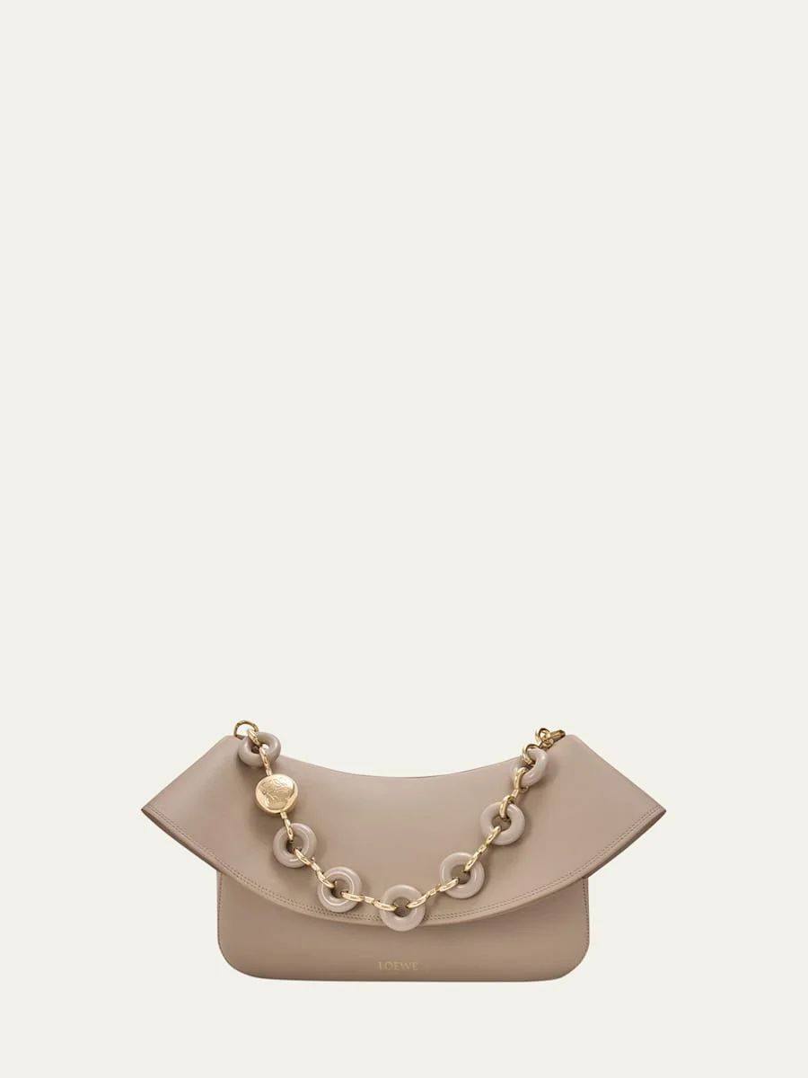 Lightweight and versatile, this Loewe "Ola" shoulder bag is crafted in smooth calfskin leather with gold-tone metal hardware Detachable donut chain shoulder strap Detachable, adjustable leather shoulder strap Can be worn as a shoulder or crossbody bag Flap top One internal pocket Approx. 7"H x 10.1"W x 5.1"D Made in Spain Online Inquiries: BGS21_V6LM7| Store Inquiries: #5045416