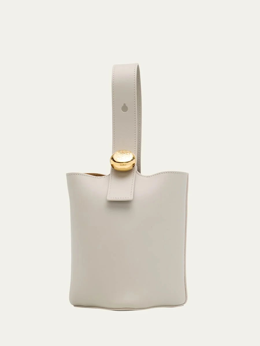 This minimalistic "Pebble" bucket bag from Loewe sports a softly structured silhouette in smooth calfskin leather, a versatile piece for any occasion Oversized Pebble closure embellished with engraved Anagram logo Adjustable top handle, 5.9" max drop Detachable, adjustable shoulder strap, 22.4" max drop Can be worn as a top handle or shoulder bag Open top with magnetic closure Interior, one slip pocket Suede lining Approx. 7.6"H x 6.2"Dia. Made in Spain Online Inquiries: BGS21_V6LME| Store Inquiries: #5045425