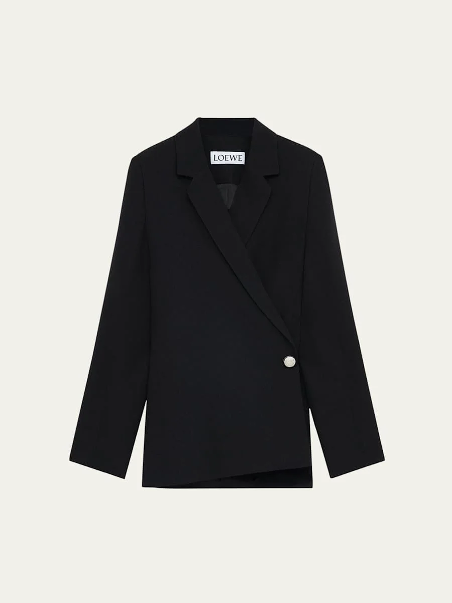 Loewe "Pebble" wrap blazer adorned with a logo-embossed knob button Notched collar; asymmetric single-breasted front Long sleeves; button cuffs Tailored fit Mid-length Viscose/elastane Made in Italy Online Inquiries: BGS21_BA74R| Store Inquiries: #5044569