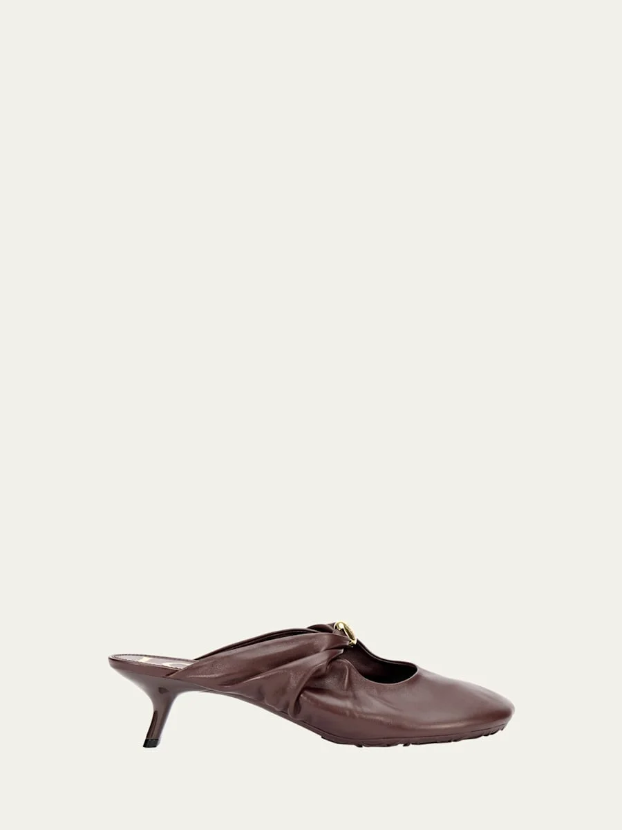 Loewe "Pebble" mules in soft leather and faux leather (polyurethane) 1.75 in / 45 mm kitten heel Closed round toe Twisted vamp strap with gold-tone Anagram logo hardware Slip-on style Lightweight, sturdy TPU outsole Lining: Unlined Made in Italy Online Inquiries: BGS21_X6XY7| Store Inquiries: #5045607