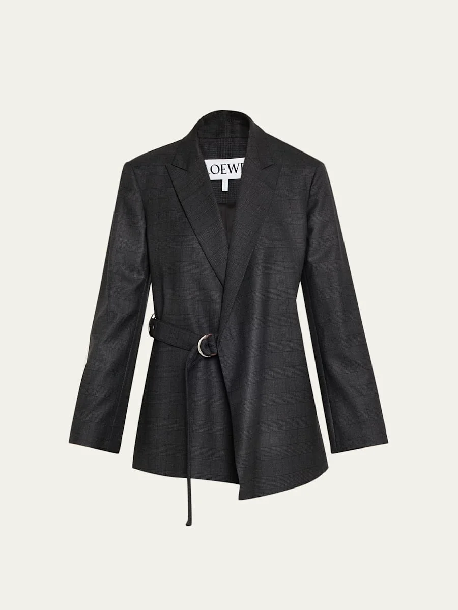 This draped blazer by Loewe is tailored from plaid woolblend suiting Peak lapels Long sleeves Midlength Wrap silhouette Adjustable Dring belt closure Viscose/wool/leather Professional cleaning recommended Made in Italy