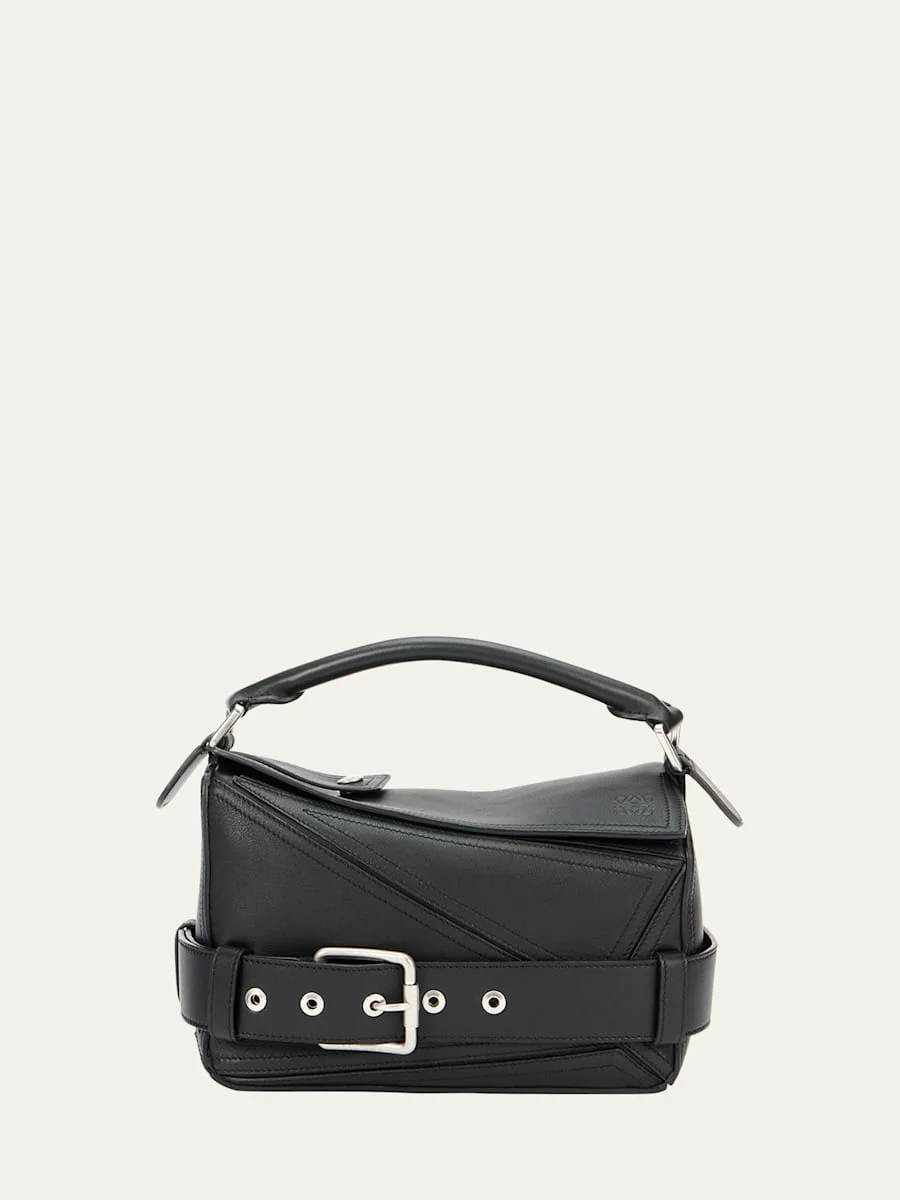 Made of shiny calfskin leather, this Loewe top-handle bag features biker-inspired details and signature puzzle stitching Rolled top handle Detachable, adjustable crossbody strap Can be worn as a top handle or shoulder/crossbody bag Zip closure with flap top Exterior, back zip pocket Herringbone cotton canvas lining Approx. 6.4"H x 9.4"W x 4.1"D Made in Spain Online Inquiries: BGS21_V6LMF| Store Inquiries: #5045426