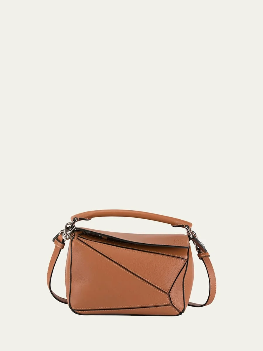 Loewe classic calf leather satchel bag with signature puzzle-piece stitching. Can be worn in five different ways and folds completely flat. Rolled top handle; approx. 1.5" drop. Removable, adjustable shoulder strap; approx. 45"L. Zip top covered by flap. Embossed Anagram at flap corner. Two interior credit card slots. Asymmetric back zip pocket. Herringbone cotton canvas lining. Approx. 4.9"H x 7.1"W x 3.1"D. Item weight: 0.24kg. "Puzzle" is made in Spain. Care Instructions: LOEWE items will maintain their qualities if it is not directly exposed to sources of light and heat, are stored inside their cloth case, and is not over-filled so they can conserve their original shape. Avoid excessive contact with water, oils, perfumes, or cosmetics. If your item gets wet, remove excess moisture by dabbing with a soft cloth and let dry at room temperature. Always follow the care instructions on the label. For leather handbags, suede handbags, and exotic leather products, variations in tone, marks or grains are natural features that should not be considered imperfections. Imperfections in our fabric and canvas products are part of their nature too and should be celebrated. Online Inquiries: BGS21_V5YHH| Store Inquiries: #2790004