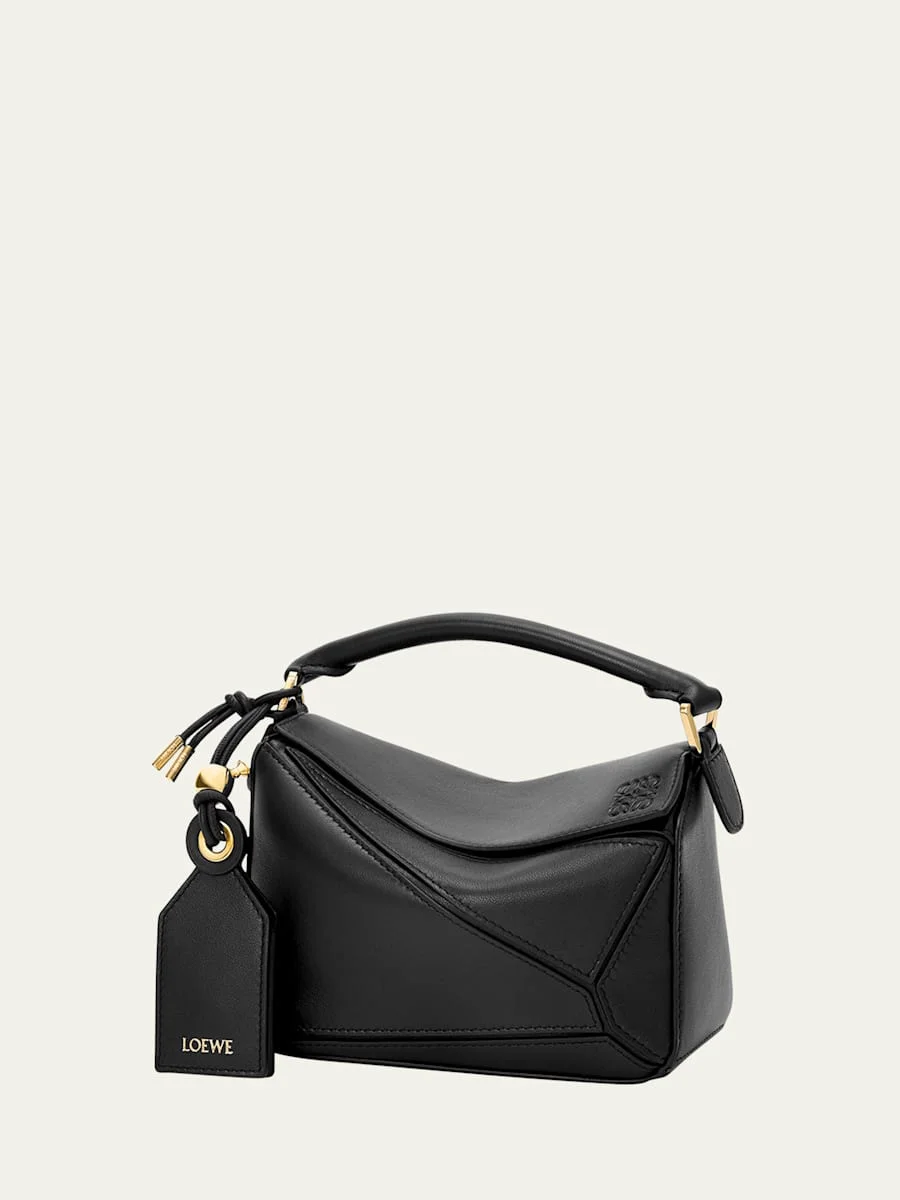 Distinctive geometric lines define the Loewe "Puzzle" top-handle bag, designed here in nappa lambskin leather with an embossed Anagram logo Rolled top handle Detachable, adjustable shoulder strap Can be worn as a top handle or shoulder bag Flap top with zip closure Detachable logo-embossed tag Feet protect the bottom of the bag Approx. 4.9"H x 6.8"W Made in Spain Online Inquiries: BGS21_V6LMB| Store Inquiries: #5045421