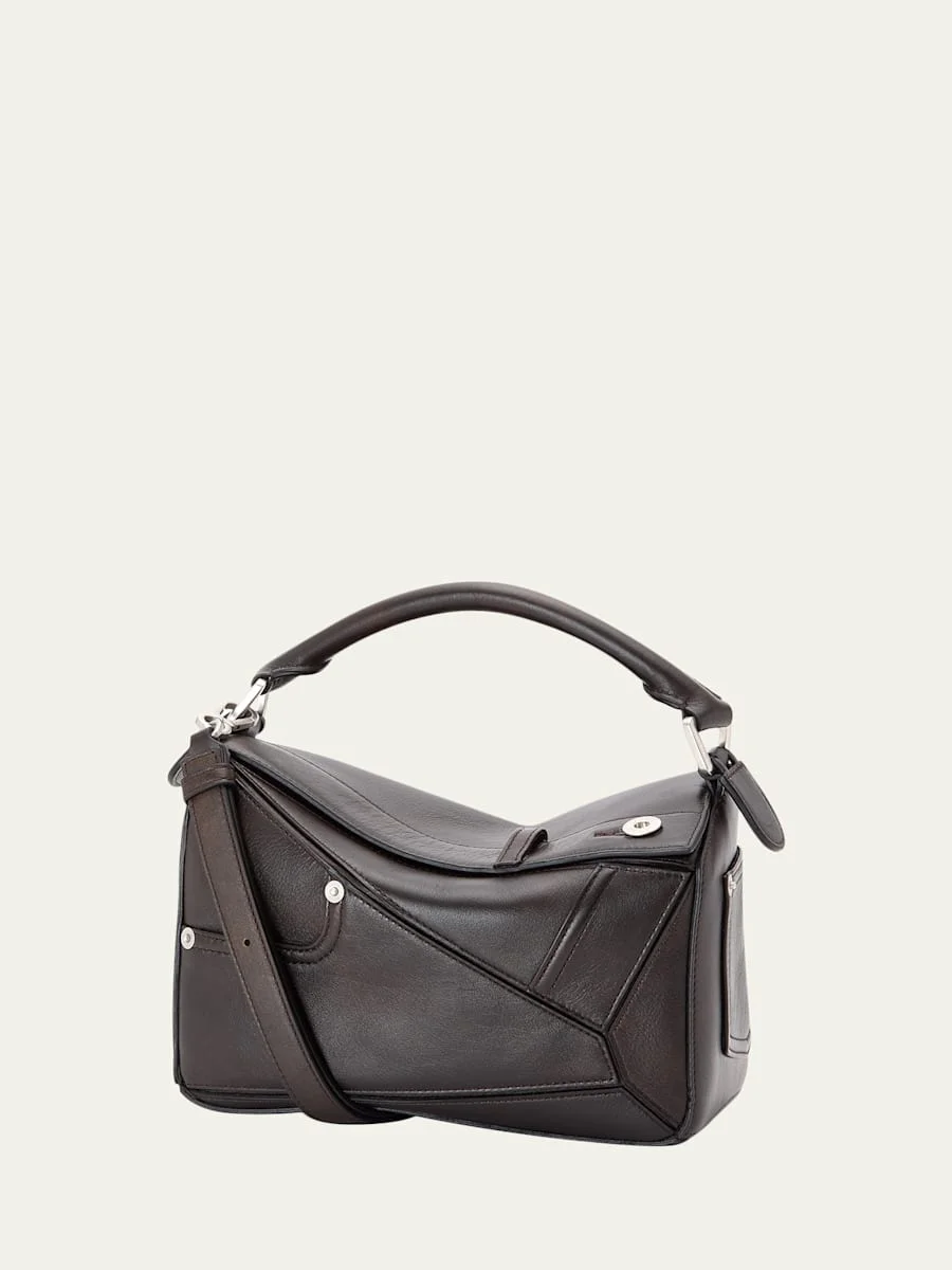 This Loewe shoulder bag is constructed in leather, designed with pantstyle accents and signature geometric Puzzle stitching Rolled top handle Detachable, adjustable shoulder strap Can be worn as a top handle or shoulder bag Foldover top with zip closure Approx. 6.4"H x 9.4"W x 4.1"D Professional cleaning recommended Made in Spain
