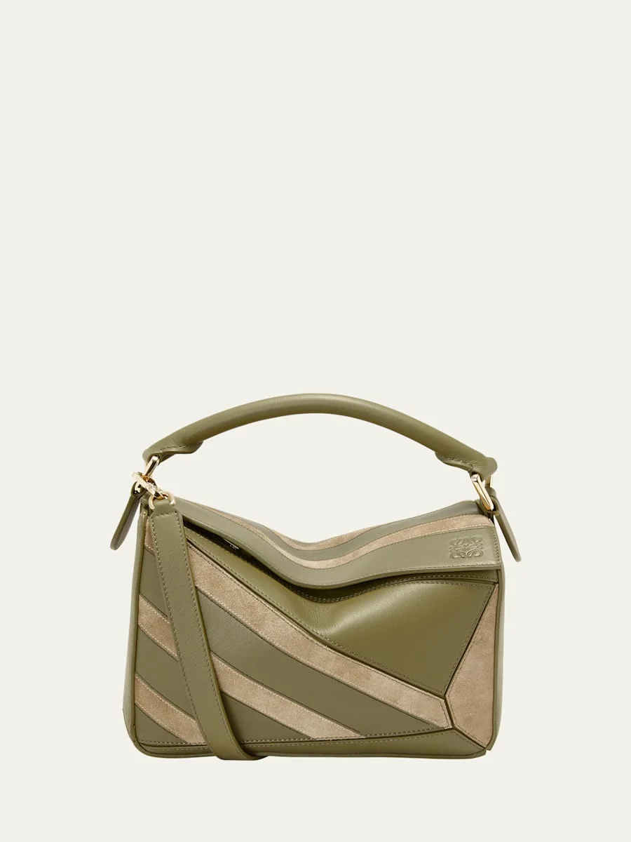This "Puzzle" tophandle bag from Loewe contrasts smooth leather with suede, the distinctive stripes elevated by the signature geometric lines Rolled top handle Detachable, adjustable shoulder strap Can be worn as a top handle or shoulder bag Flap top with zip closure Approx. 6.4"H x 9.4"W Made in Spain