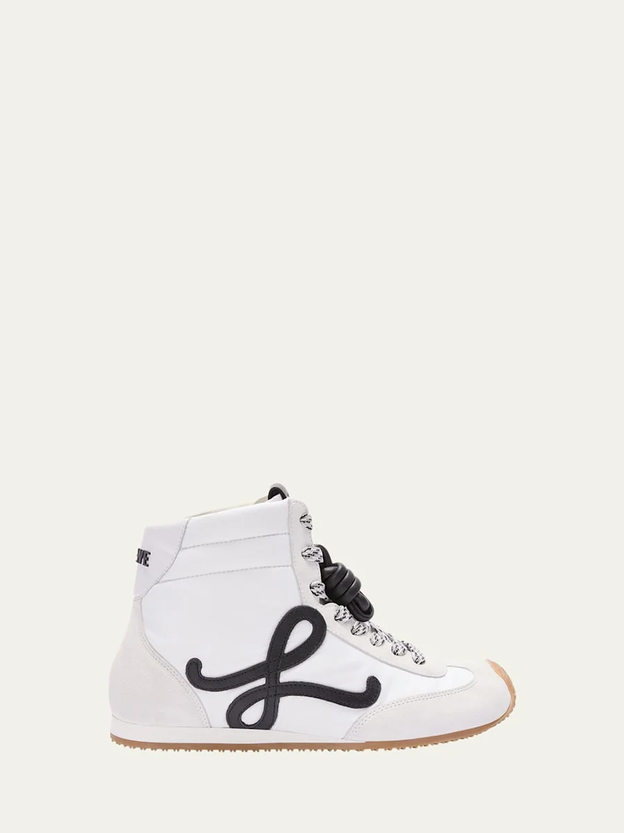 Loewe retro high-top runner sneakers in colorblocked fabric, suede and leather. 0.17 in / 5 mm flat heel. Round toe. Lace-up vamp. Cushioned footbed. Lightweight, sturdy TPU outsole. Lining: Unlined. Professional cleaning recommended. Made in Italy. Online Inquiries: BGS21_X6V0T| Store Inquiries: #4985084