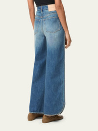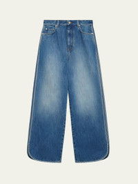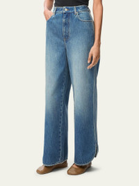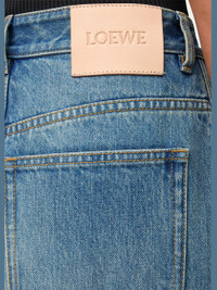 Loewe faded medium wash denim jeans featuring rounded hem and a logo embossed leather patch on the back High rise Five-pocket style Wide legs Full length Button/zip fly; belt loops Cotton/polyester/leather Made in Italy Online Inquiries: BGS21_BA74N| Store Inquiries: #5044565