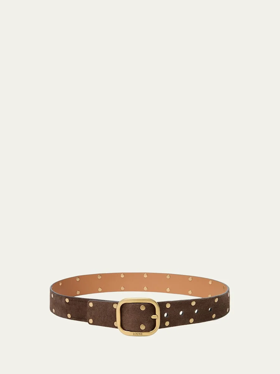 Loewe soft suede calfskin belt accented with allover stud embellishments. Approx. 1.4"W Adjustable fit Rounded logoengraved goldtone buckle Prong closure Suede Made in Spain
