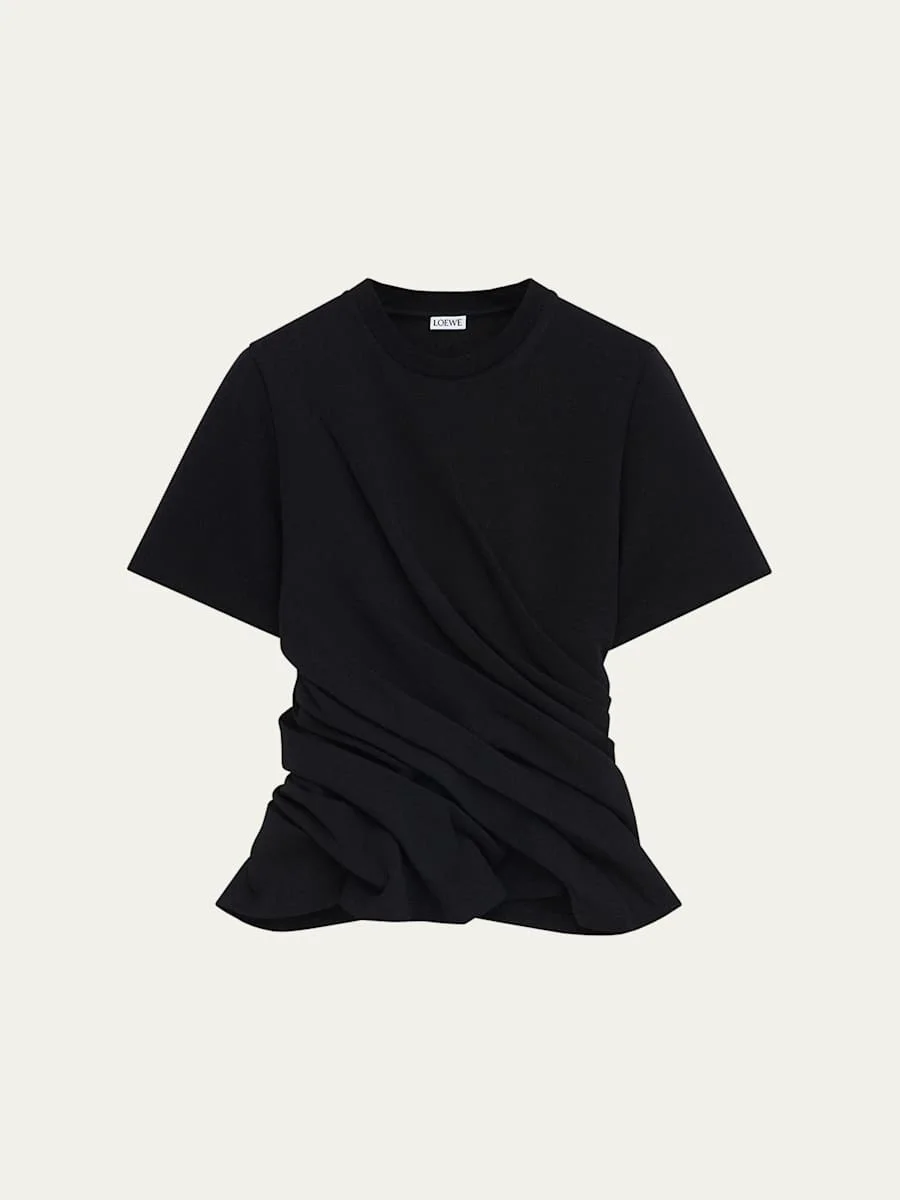 Loewe T-shirt featuring a draped twisted waist and an anagram embroidered back Crew neckline Short sleeves Slim fit Pullover style Cotton/viscose Made in Portugal Online Inquiries: BGS21_BA752| Store Inquiries: #5044584