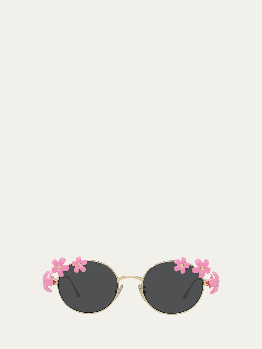 Loewe oval sunglasses are adorned with colored flowers in relief on the top part of the frame Eye/bridge/temple (in mm): 51-20-140 Solid lenses Adjustable nose pads Thin, tapered arms Capped earpieces Metal 100% UVA/UVB protection Made in Italy Proposition 65 warning for California residents Online Inquiries: BGS21_D59CS| Store Inquiries: #5027078