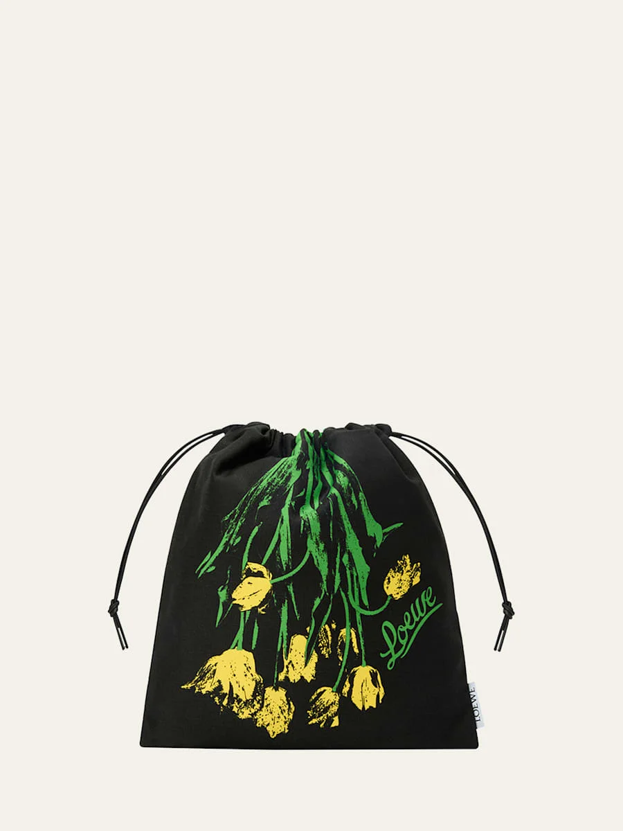 Loewe fabric pouch bag with tulip print Drawstring closure Approx. 9.8"H x 10.1"W x 1.2"D Cotton/linen/leather Made in Spain Online Inquiries: BGS21_V6JY5| Store Inquiries: #5025243