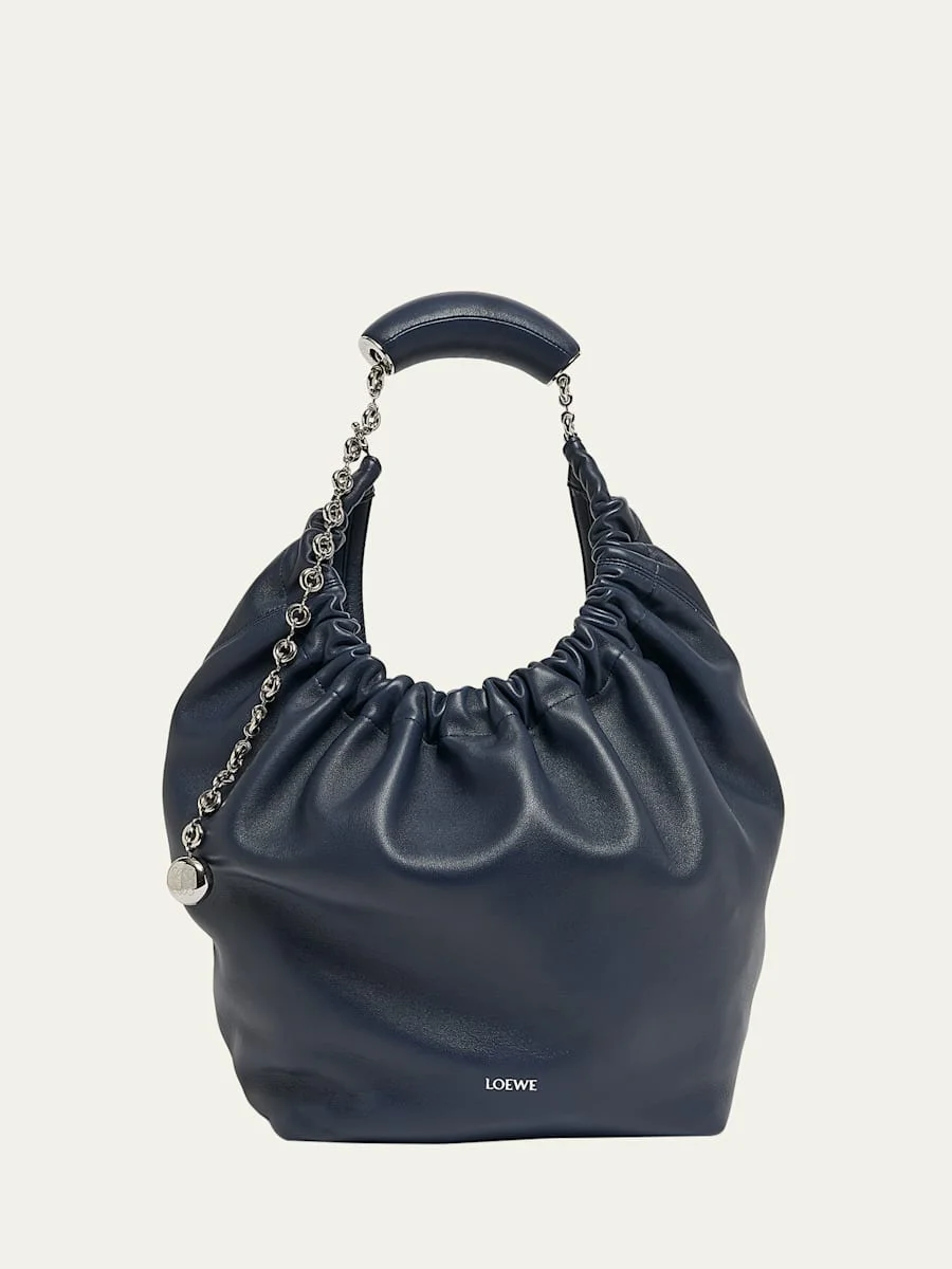 Loewe hobo bag in leather, cotton, and linen Chain top handle Ruched open top with magnetic closure Interior, one zip pocket Approx. 12.9"H x 13.3"W x 5.3"D Made in Spain